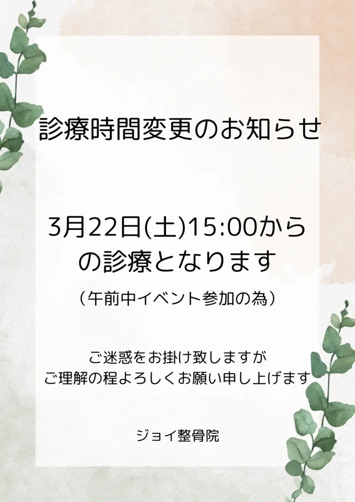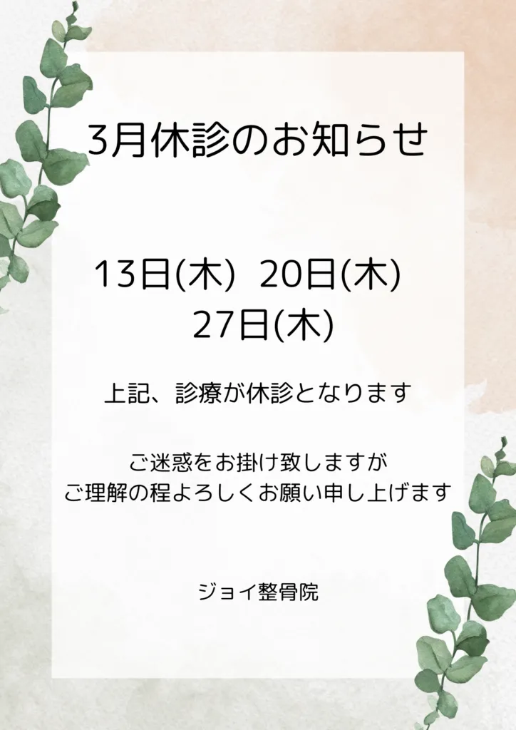 🍀3月休診日と診療時間変更のお知らせ🍀 2025/03/10 13日、20日、27日の(木)を休診とさせて頂きます。 22日(土)の診療時間を15:00〜17:30に変更させて頂きます。 ご迷惑をお掛け致しますがよろしくお願い致します😌